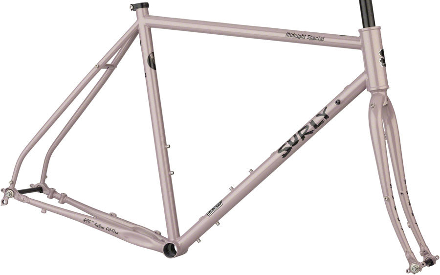 Surly Midnight Special Frameset - 650b Steel Metallic Lilac 58cm. The Midnight Special is a road plus bike designed to provide comfort and speed on those all-day rides that extend well beyond fresh pavement. It excels on pot-holed deteriorating pavement and the occasional long stretch of gravel. The Midnight Special’s 650b road plus tires eat up road chatter and absorb all the bumps in the road for a much more comfortable ride.100% Surly Chromoly frame main triangle is double-butted; 1-1/8" threadless Chromoly fork