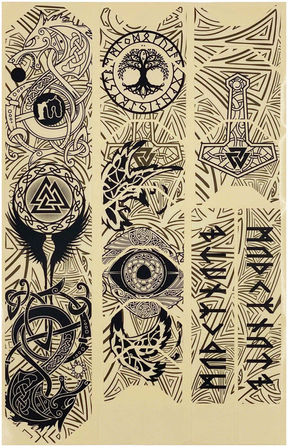 Muckynutz Viking Frame Protection - 17-Piece Black Matte. Muckynutz Frame Skinz- protects your bikes vulnerable areas from chips and scratches. Designs are printed on a transparent background blending perfectly into your bikes natural color scheme. The seventeen patches can be used independently or in harmony letting you decide what areas to protect.Universal fitting: suitable for alloy and carbon frames
