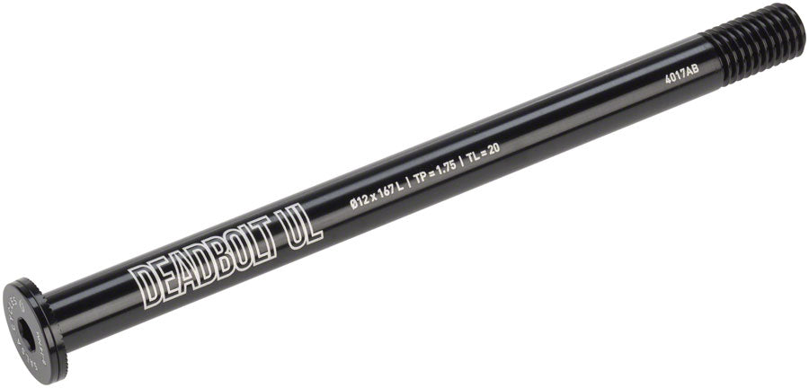 Salsa Deadbolt Ultralight Thru-Axle Rear 12mm Axle Diameter 167mm Length 1.75 Thread Pitch 20mm Thread Length. The Deadbolt Ultralight Thru-Axles are offered in a 6mm flat button head design for a flush clean look. Lightweight easy to use and secure.CNC-machined from 7000 series aluminum